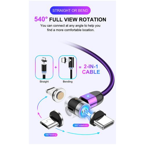 540 Graders magnetisk multiladdare för Apple, Micro USB och Type C med stöd för dataöverföring.